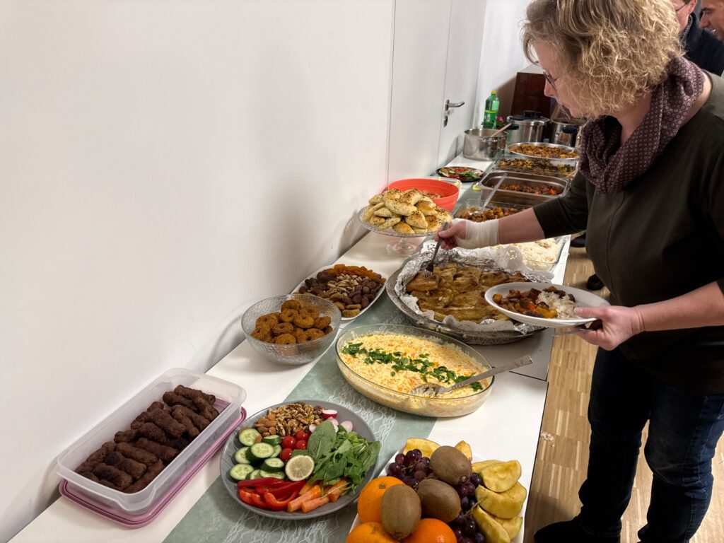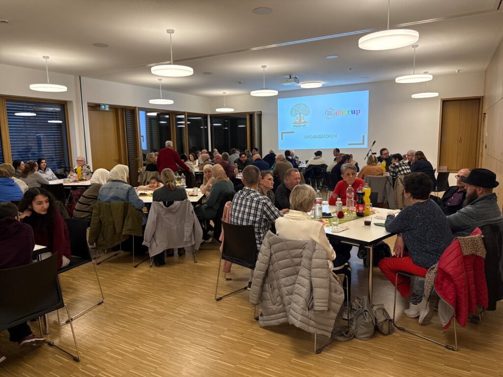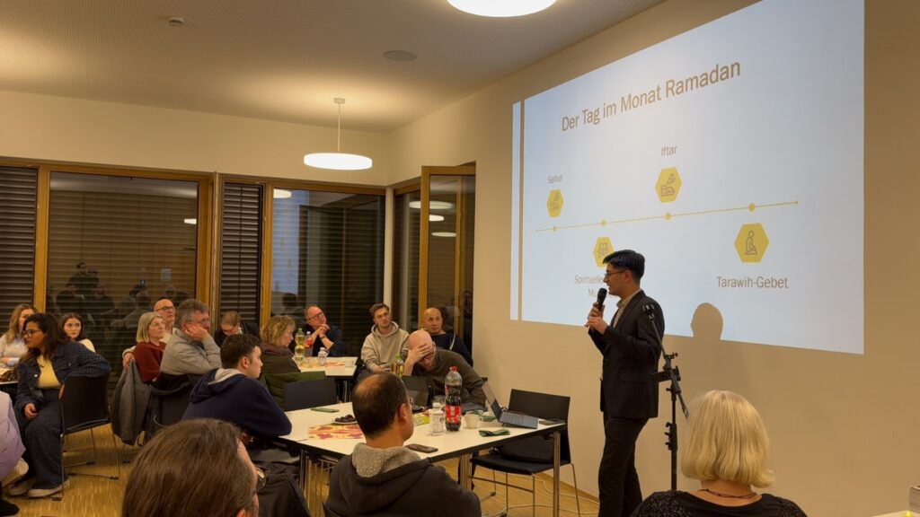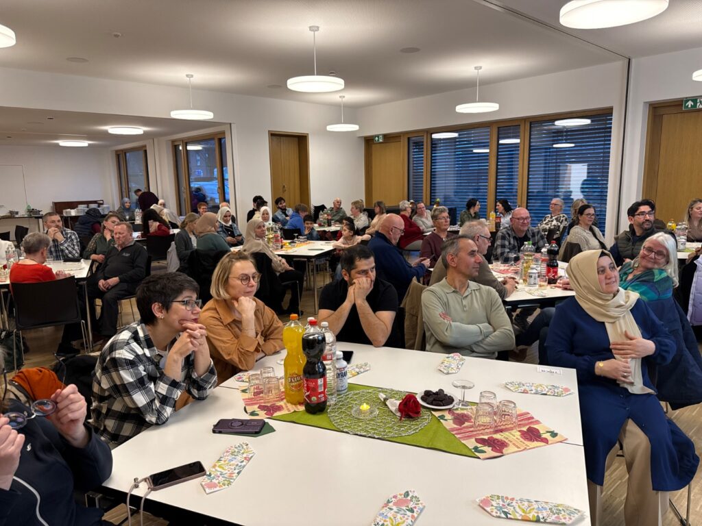 Im Anschluss erläuterte ein Vertreter von MüBiKult die religiösen Grundlagen des Fastenmonats, den täglichen Ablauf, die Bedeutung der Gebete sowie die geltenden Regeln und Ausnahmen, etwa für Kinder, ältere Menschen oder Personen mit gesundheitlichen Einschränkungen. Viele der nichtmuslimischen Gäste nutzten die Gelegenheit, Fragen zu stellen und vertiefte Einblicke in die Traditionen des Ramadans zu gewinnen. Zum Abschluss wechselten die Teilnehmenden die Sitzplätze, um neue Kontakte zu knüpfen und den interkulturellen Dialog weiter zu stärken. Die Veranstaltung wurde als harmonisch und bereichernd wahrgenommen und trug spürbar zum gegenseitigen Verständnis bei.